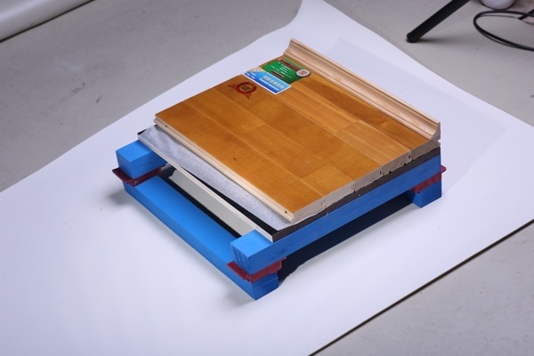 此摩擦阻力可在阻力测试仪的表盘上直接读取。依据其给定的滑动摩擦阻力计算公式换算出Sp。以此方法计算不同试验条件育木地板滑动摩擦性能。Sp测试方法:以涂饰漆种、漆膜厚度以及不同砂纸目数获得的素板表面粗糙度作为影响体育木地板表面Sp主要因素,在实验室条件下进行素板及漆板(组装成2000mm×2000mm试验样板)不同表面粗糙度、不同测试角度(垂直与平行)和不同的相邻地板间隙条件下的Sp测试。测试温、湿度分别为23±2℃和65%~70%的环境条件。测试位置与数量依据中国标准GB/T《体育馆用木质地板》中测试点选取要求进行选取。选取5个测试位置,更后结果为5个测试值的平均值。欧氏运动木地板所有产品都通过行业DIN质量标准检测。